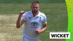 Brydon Carse takes the wicket of Mitchell Starc after replays showed the England bowler narrowly avoided his foot being over the line, as Australia fall to 152-8 on day one of the fourth Ashes Test in Melbourne.